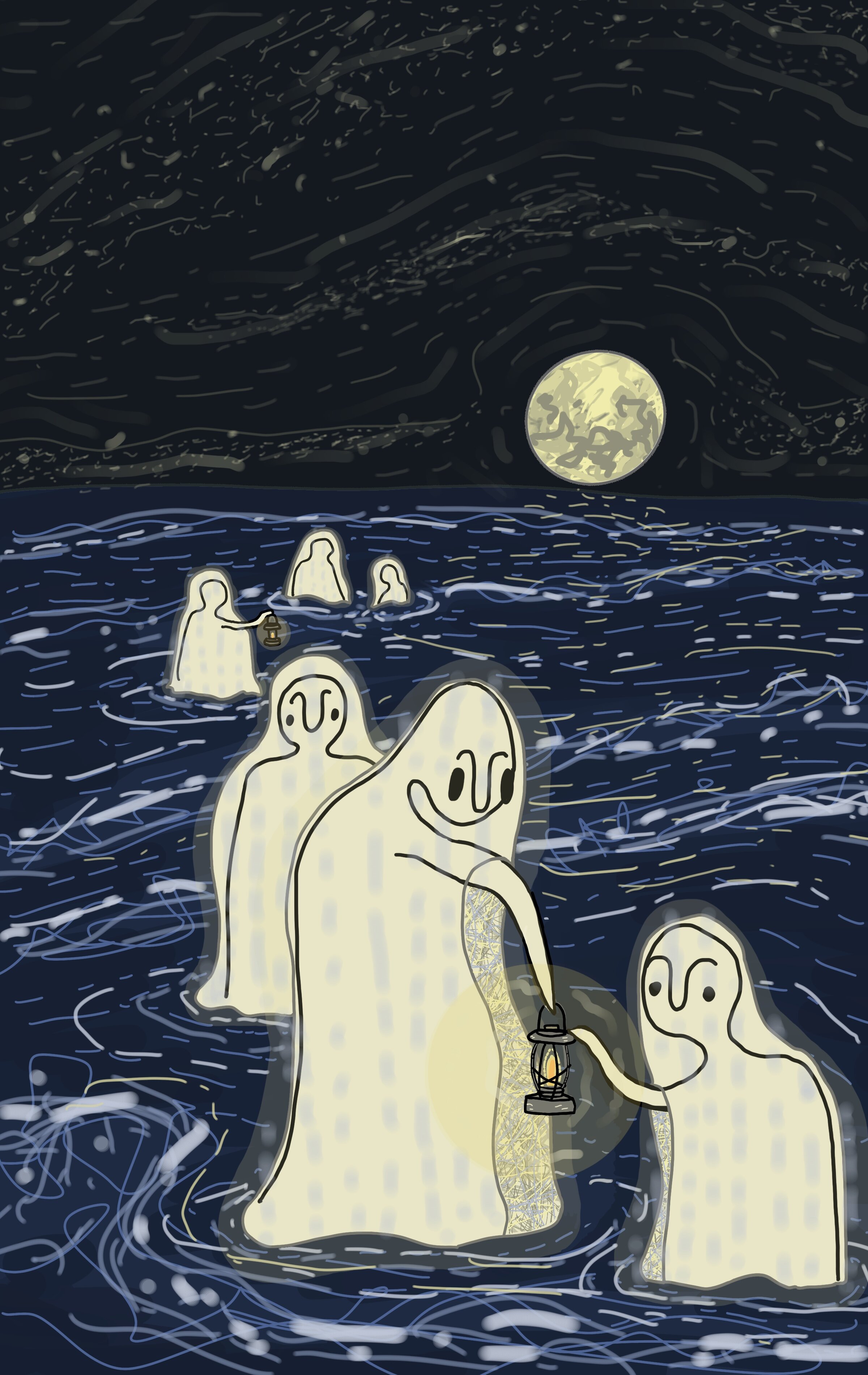 Sinking Between the Moon and the Sea Digital illustration of some luminescent creatures leading each other back into the sea, 2400 x 3800 px